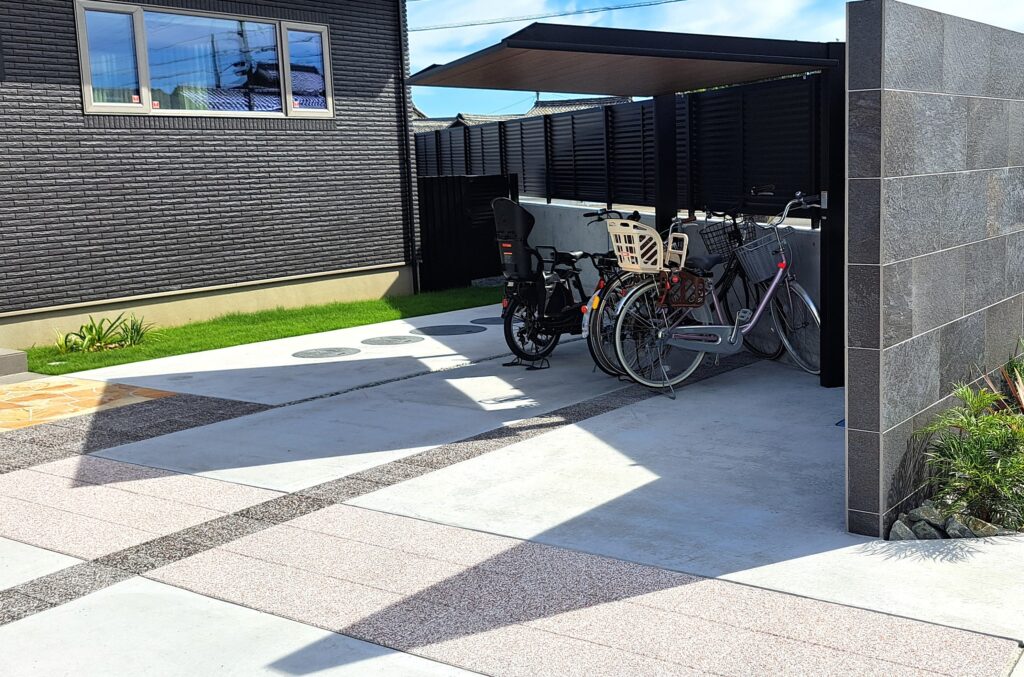 カーポートとサイクルポートをを同じデザインで揃えることで、外構全体に統一感が生まれます。屋根形状やカラー、素材を合わせることで、住まいの印象がより洗練されたものに。実用性だけでなく、見た目にも美しい外構プランになりました。