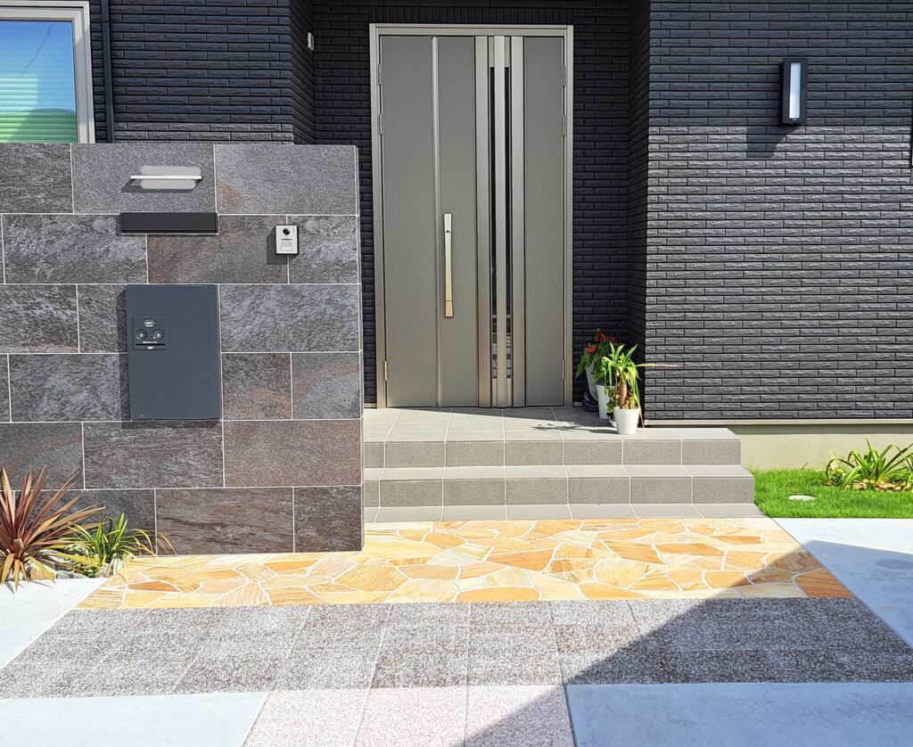 石調タイルを使用した門壁は、建物の外観と統一感を持たせつつ、上質で落ち着いた印象を演出しています。
