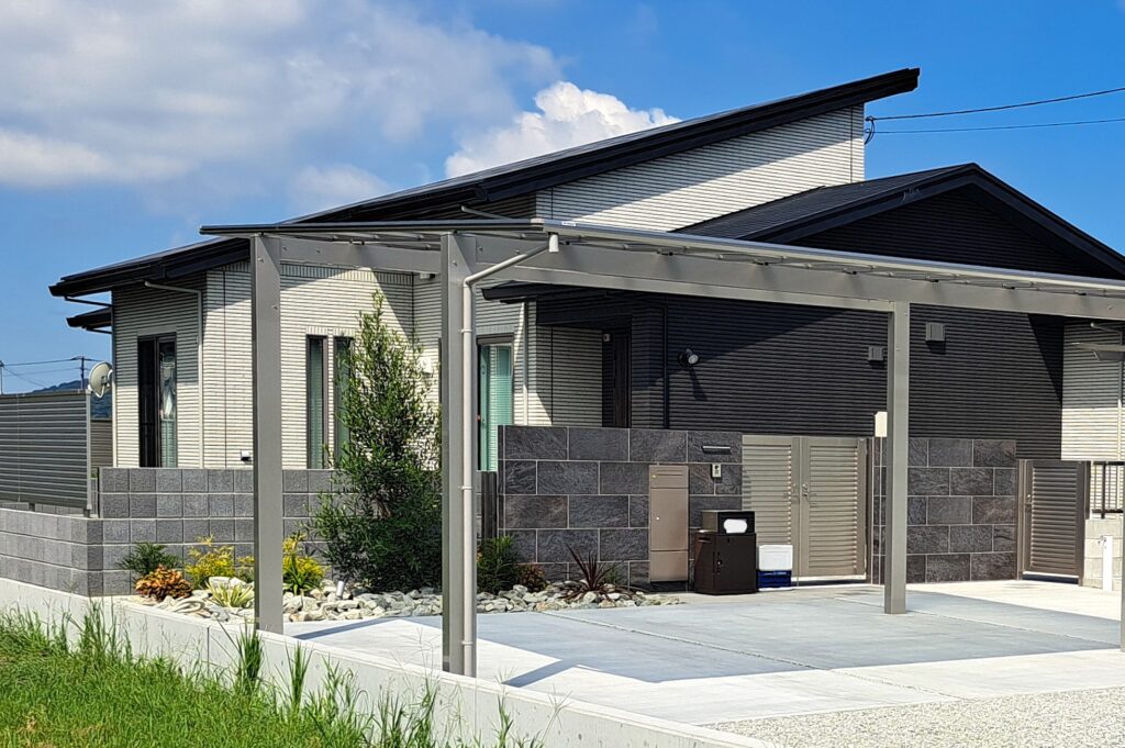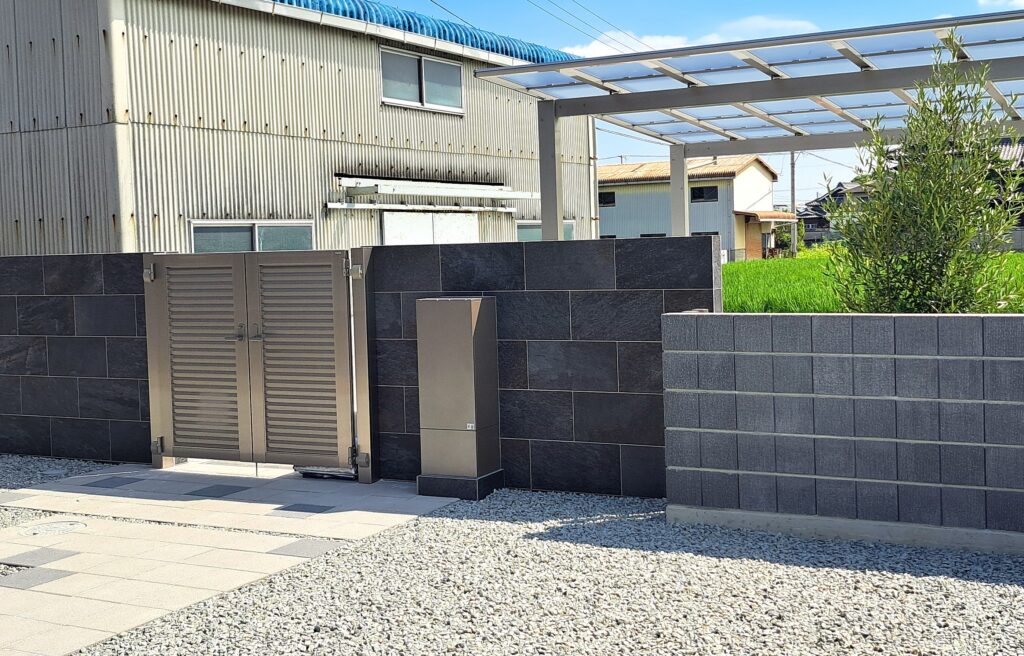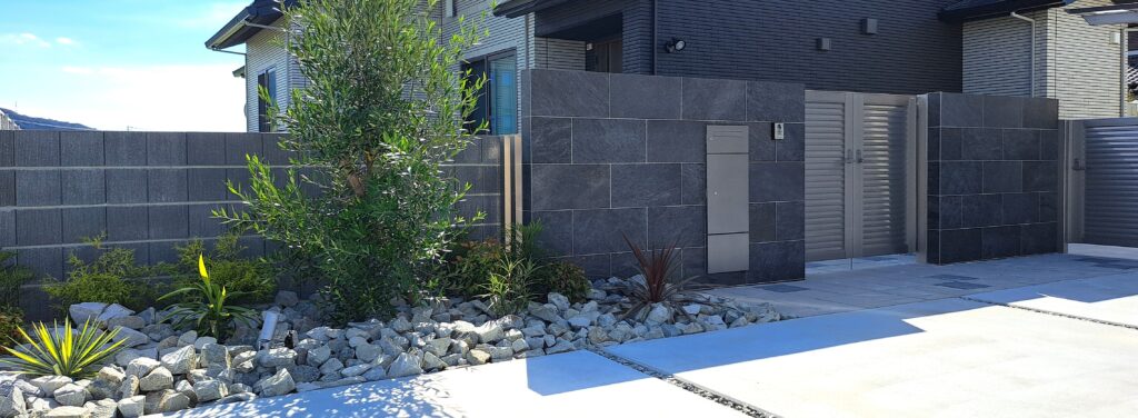 建物の外観カラーに合わせて、門まわりや塀、カーポートをダークトーンでまとめており、住宅と外構が一体となったデザインに仕上がっています。門まわりは高さのあるブロック仕上げにより、外からの視線をやわらかく遮りつつ、圧迫感を感じさせません。足元の植栽や割石が、無機質になりがちな空間に自然な表情をプラスし、上質感を引き立てています。