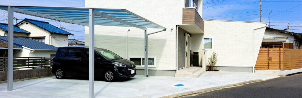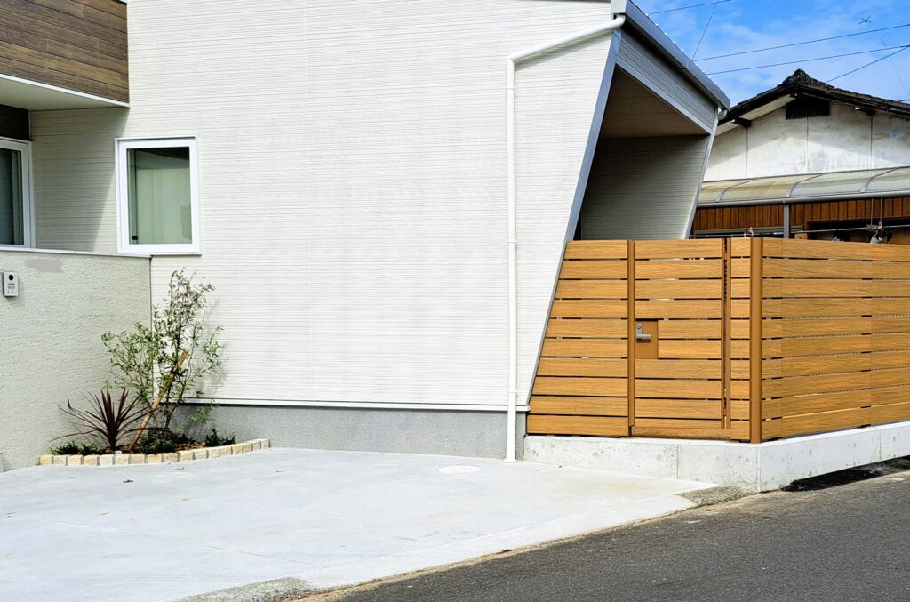 建物外観の色味と調和する木目調の目隠しフェンスを設置しました。ナチュラルな木目カラーを採用することで、建物外壁とのバランスを取り、全体にやさしく落ち着いた印象を与えています。道路側からの視線をしっかり遮りつつ、横板の隙間によって圧迫感を抑え、開放感も確保しました。