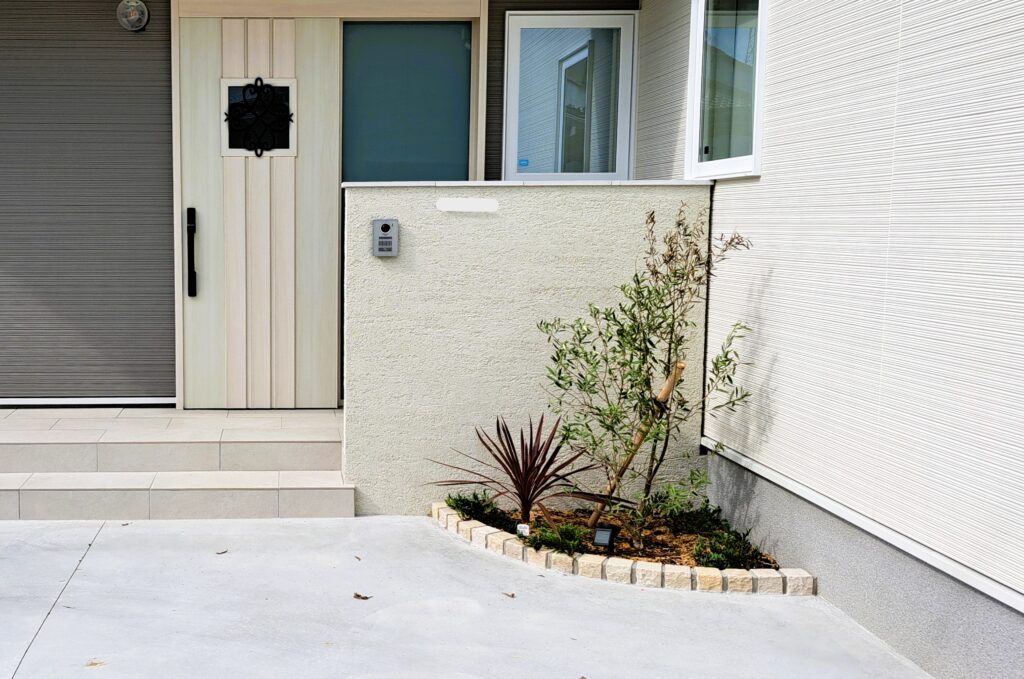 植栽のグリーンがやさしく映えることで、シンプルな中にも自然なアクセントを加えています。
