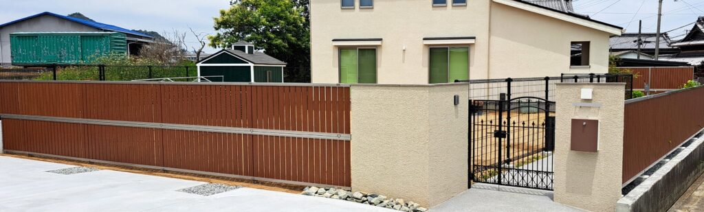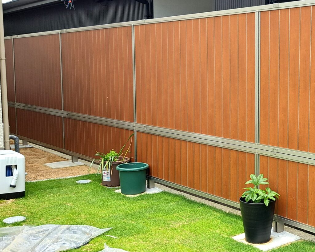 隣地住宅に面する部分には、隙間のない木調の目隠しフェンスを設置。 外からの視線をしっかり遮り、プライベート空間を確保しています。