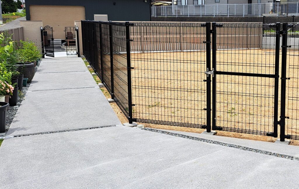 目隠し・メッシュ・門扉付きフェンスを場所ごとに使い分け、 安全性・見た目・使いやすさのバランスを重視した配置計画としています。 用途に合わせたフェンス選びで、快適なドッグラン空間が完成しました。