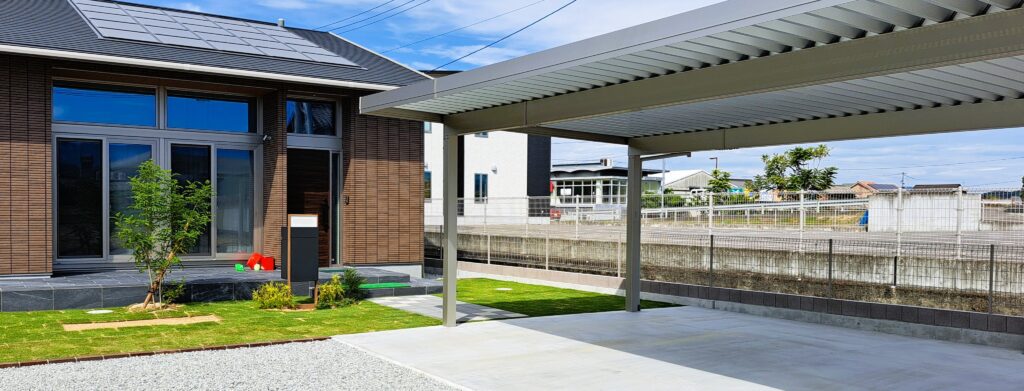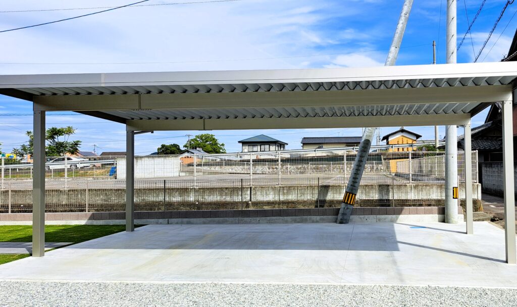 広々とした駐車スペースには、耐久性と強度に優れた金属製の折板屋根カーポートを設置。強風や大雨に強く、安定した強度を確保しました。耐候性にも優れているため、長く安心して使用できるカーポートとなっています。