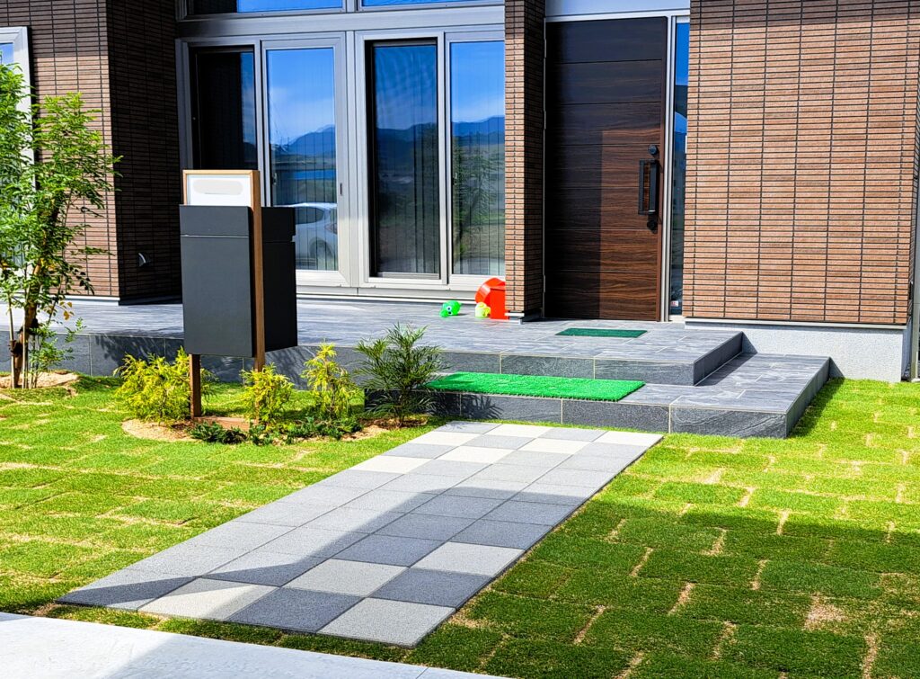 アプローチには直線的なデザインを取り入れ、住まいの顔となる玄関まわりをすっきりとした印象に。門柱と植栽をバランスよく配置することで、シンプルながらも温かみのあるエントランスを演出しました。庭部分には芝生を取り入れ、季節の緑を楽しめる空間になりました。