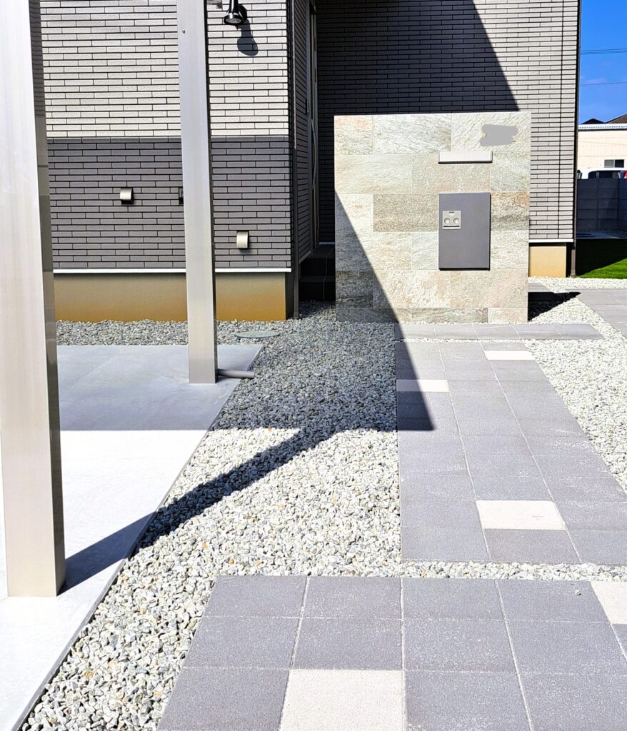 タイル張りと砂利を組み合わせたアプローチデザイン。