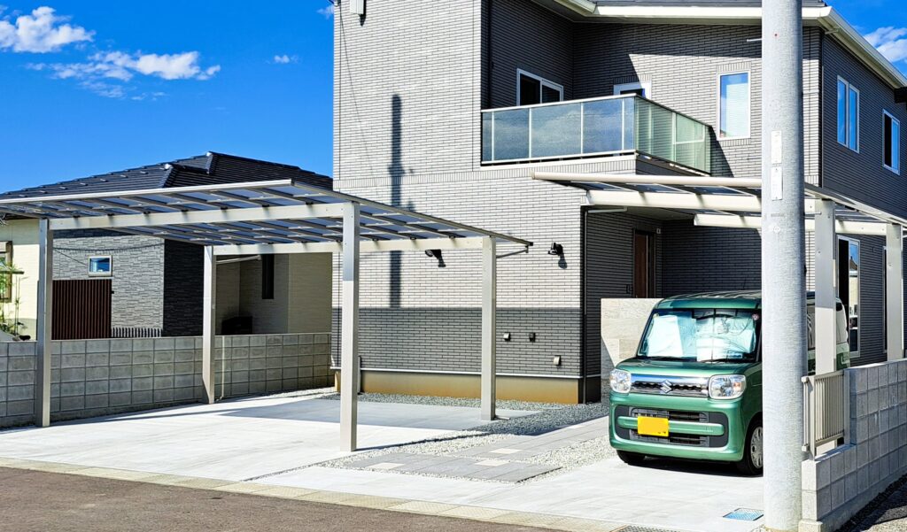 敷地の形状に合わせて独立したカーポートを2基配置。 それぞれの動線を考慮することで、日常使いしやすく、車の出し入れもスムーズです。 アルミフレームの直線的なデザインが建物外観と調和し、圧迫感のない開放的な駐車空間を実現しました。