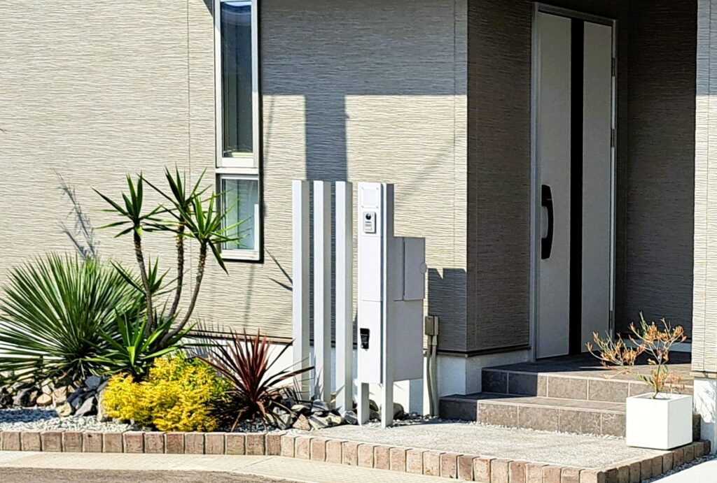 玄関まわりは白を基調にまとめ、門柱やポストも建物と統一感のあるデザインに。シンプルでありながら、印象に残るファサードになりました。