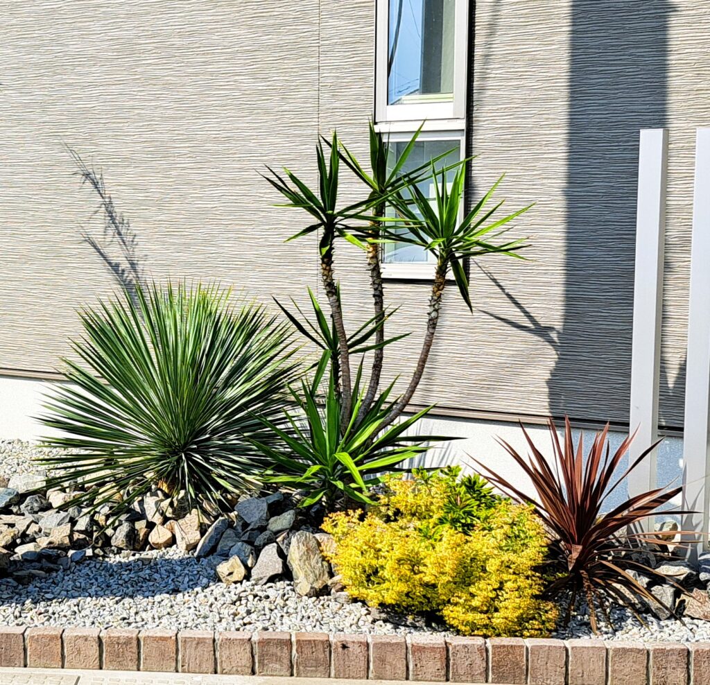 シンボルツリーやドライガーデン向きの植物をバランスよく配置し、季節を通して楽しめる外構にしました。力強い石と個性的な植栽を組み合わせ、立体感のあるデザインに仕上げています。
