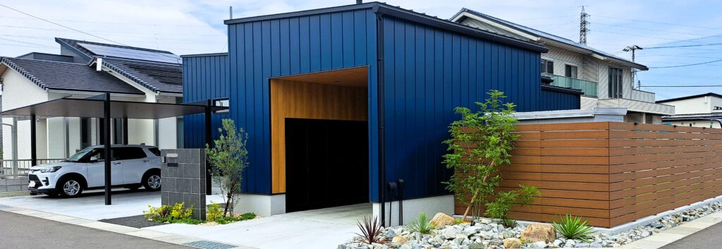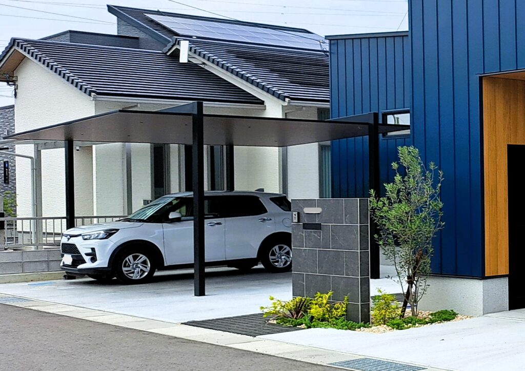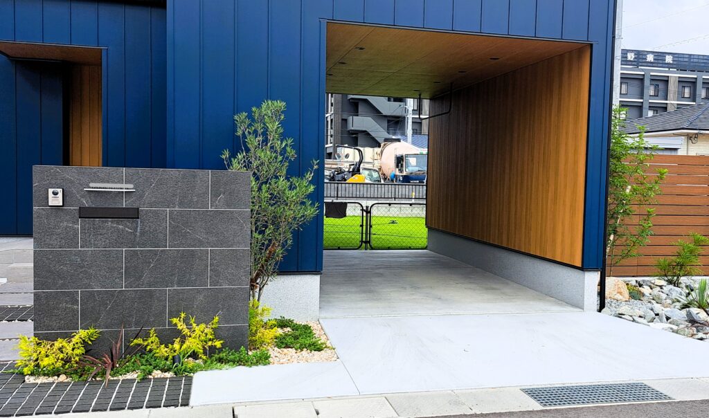 ブラックフレームのカーポートが目を引く、すっきりとした駐車スペース。屋根裏側を木目色にすることで建物の外観とよく合い、全体に統一感をもたらしています。門壁横にはシンボルツリーを配置。やわらかな樹形とやさしいグリーンが、ネイビーの外壁とブラックのカーポートに映え、外構に自然のぬくもりをプラスしています。