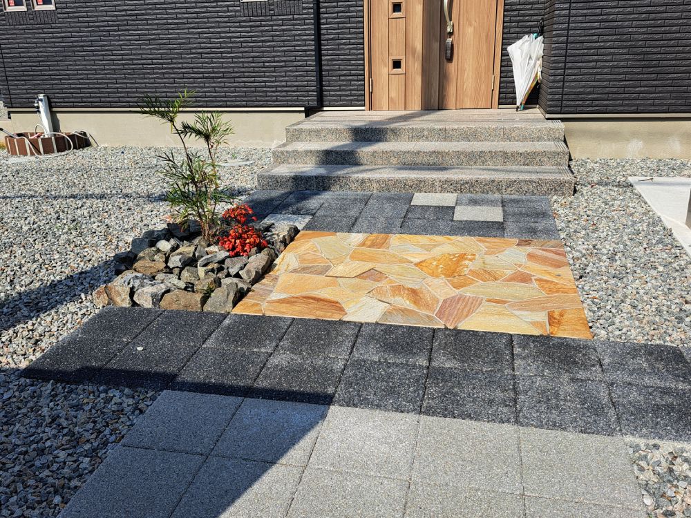 平板と乱形石を組み合わせ、リズム感のあるアプローチをデザイン。